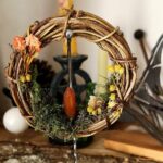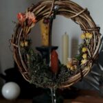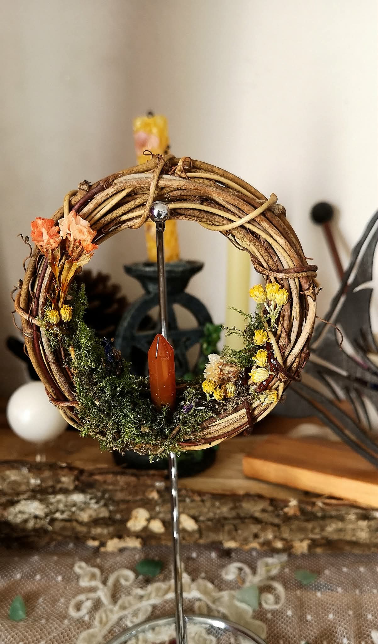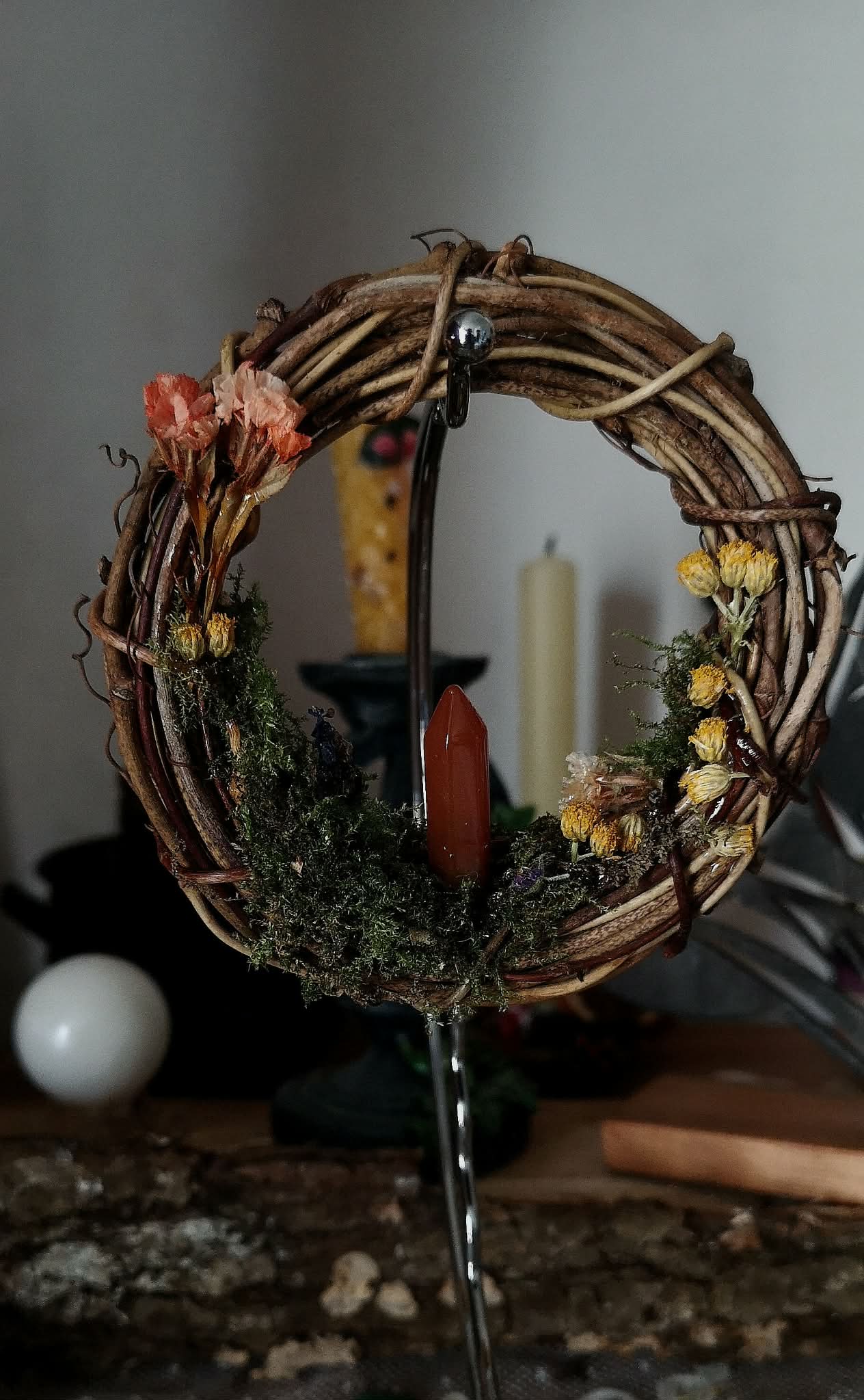 Cette couronne n’est pas un décor. C’est une présence. Elle appartient aux intérieurs où l’on honore encore les anciennes puissances — au-dessus d’un autel de saison, accrochée à la porte du logis pour appeler l’abondance, posée en offrande à la croisée des chemins.