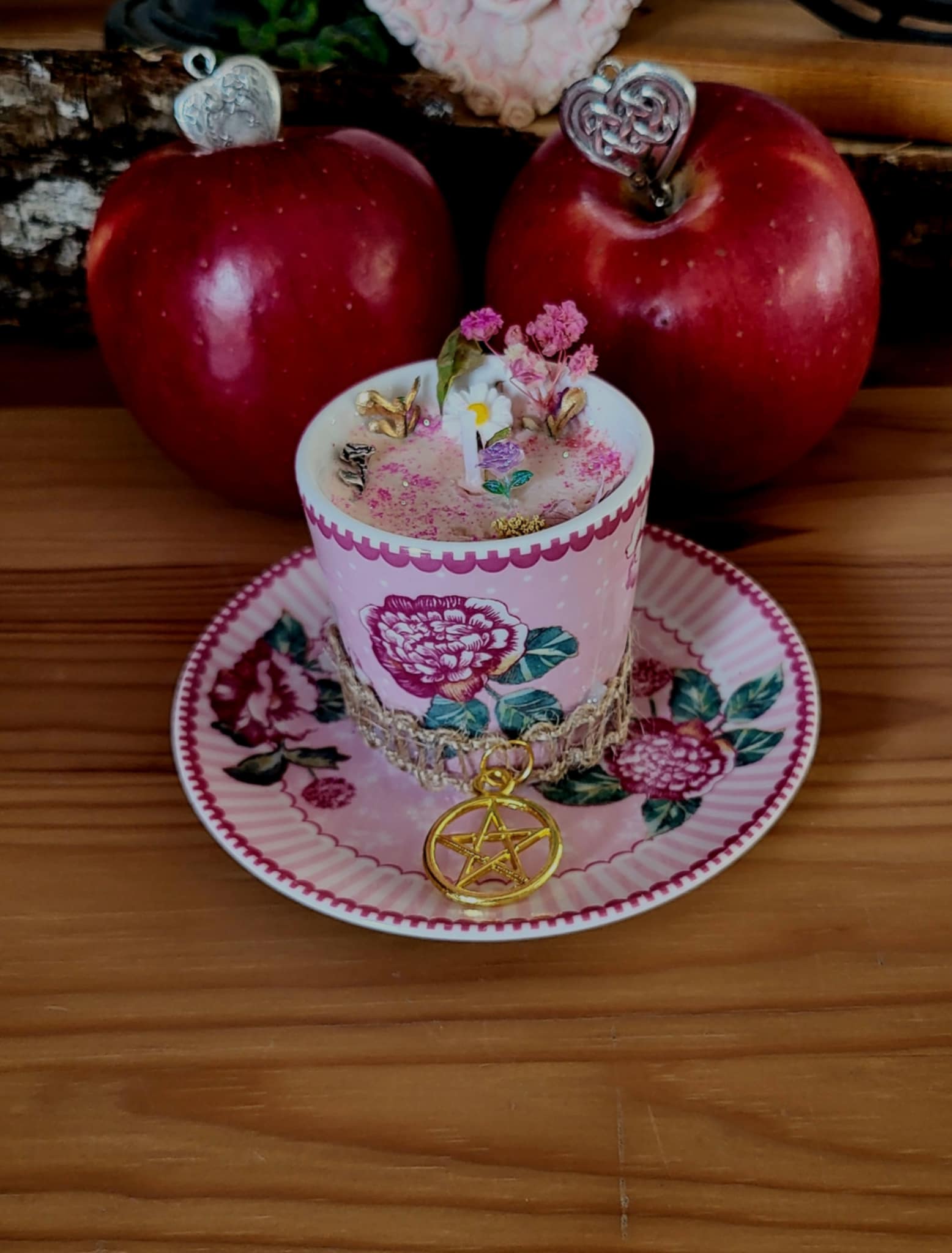 Cette création artisanale allie la tendresse romantique du style shabby chic à l’intention puissante de l’amour inconditionnel. La tasse délicatement patinée et sa soucoupe assorties accueillent une bougie décorative spécialement consacrée pour amplifier les énergies d’amour, d’harmonie et de connexion spirituelle.