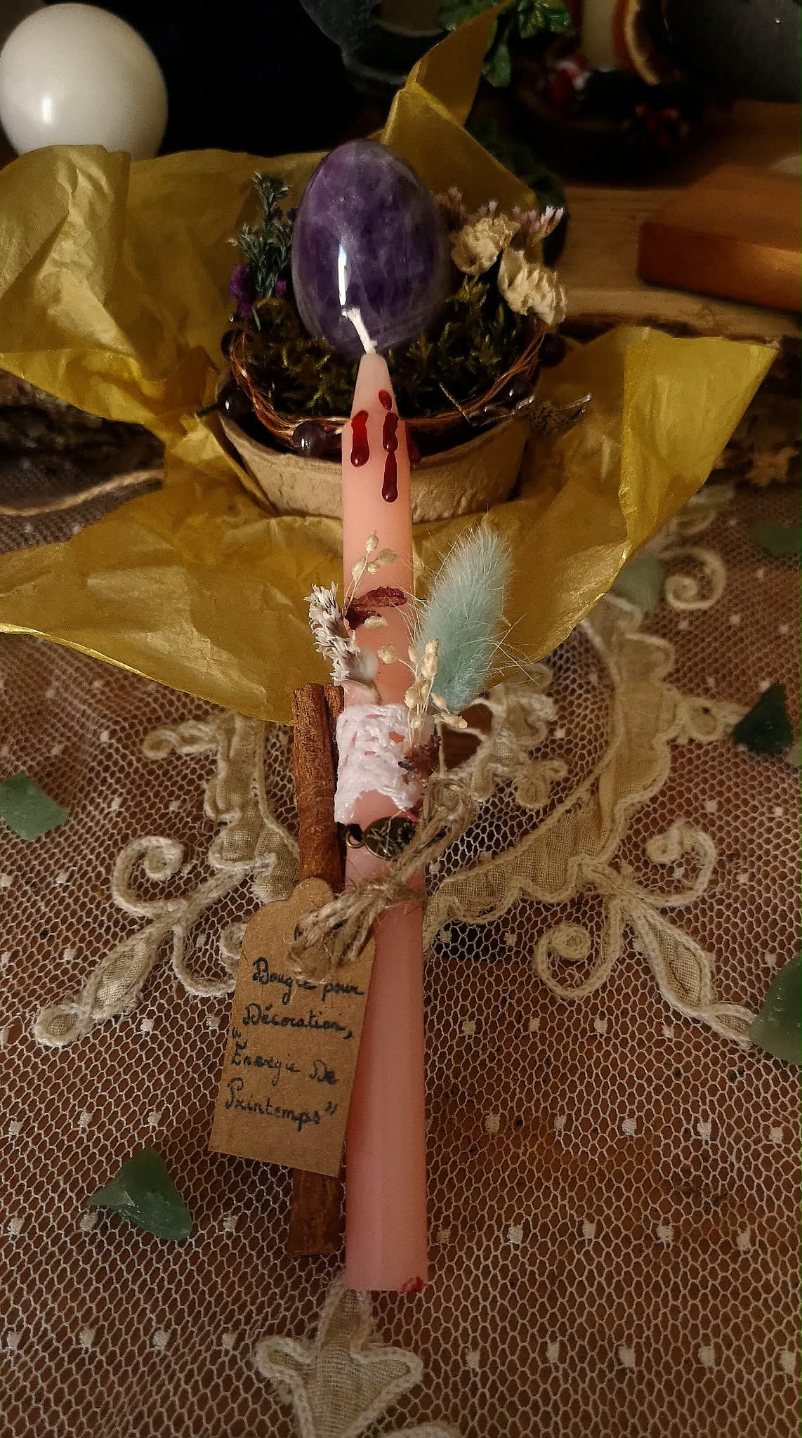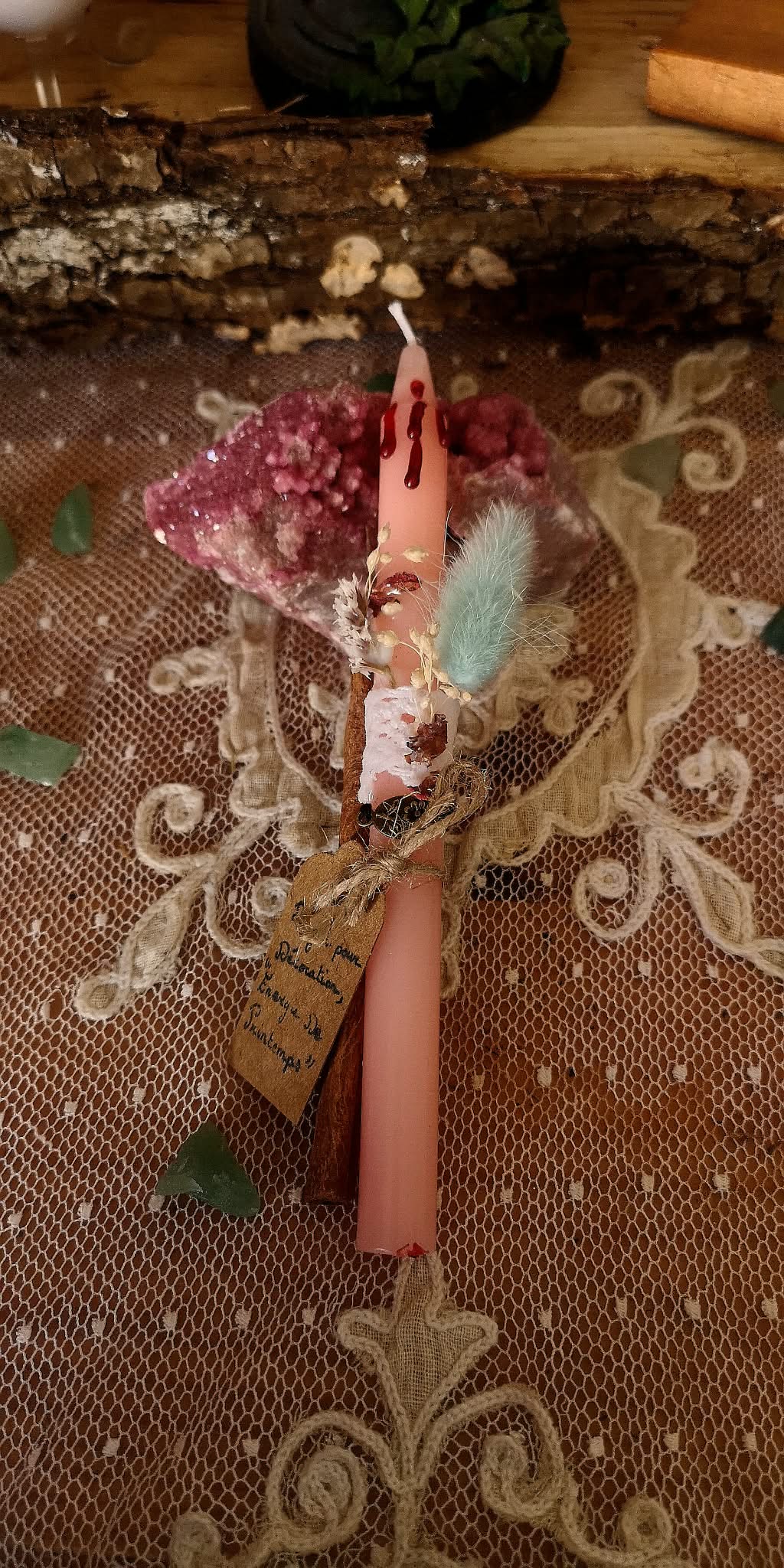 Sur votre autel dédié à Ostara ou Beltane, cette bougie devient le réceptacle de vos intentions de croissance. Elle est délicatement ornée de fleurs séchées, messagères de la beauté éphémère, et d’un bâton de cannelle, ingrédient ancestral utilisé par les sorcières pour attirer la prospérité et réchauffer l’âme.