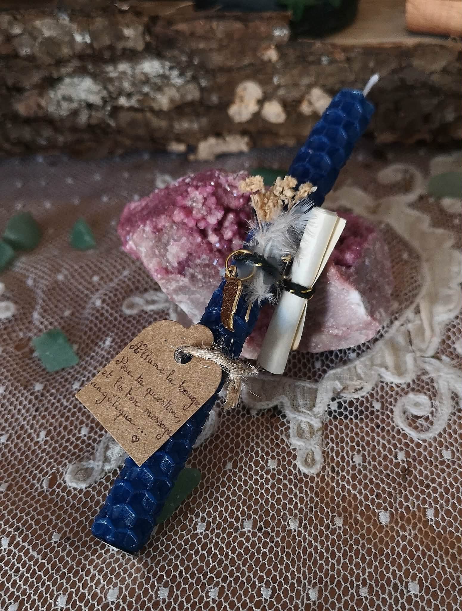 Installe-toi dans un espace apaisé, loin du bruit et de l’agitation. Prends quelques respirations lentes. Pose tes mains sur la cire bleue, formule ton intention — une parole à libérer, une réconciliation à amorcer, une paix intérieure à appeler — puis allume la flamme. Reste présente à ce qui se dépose en toi.