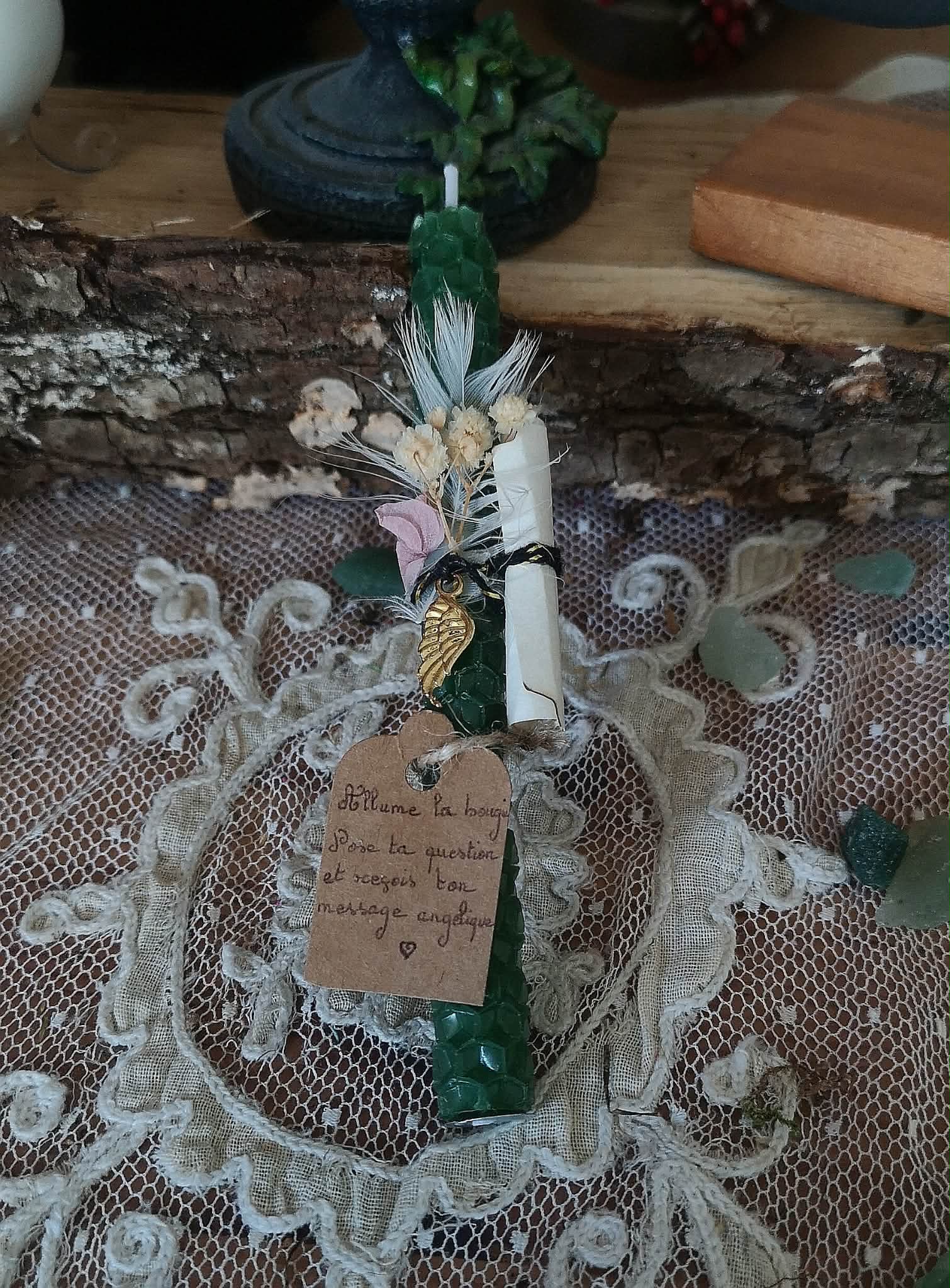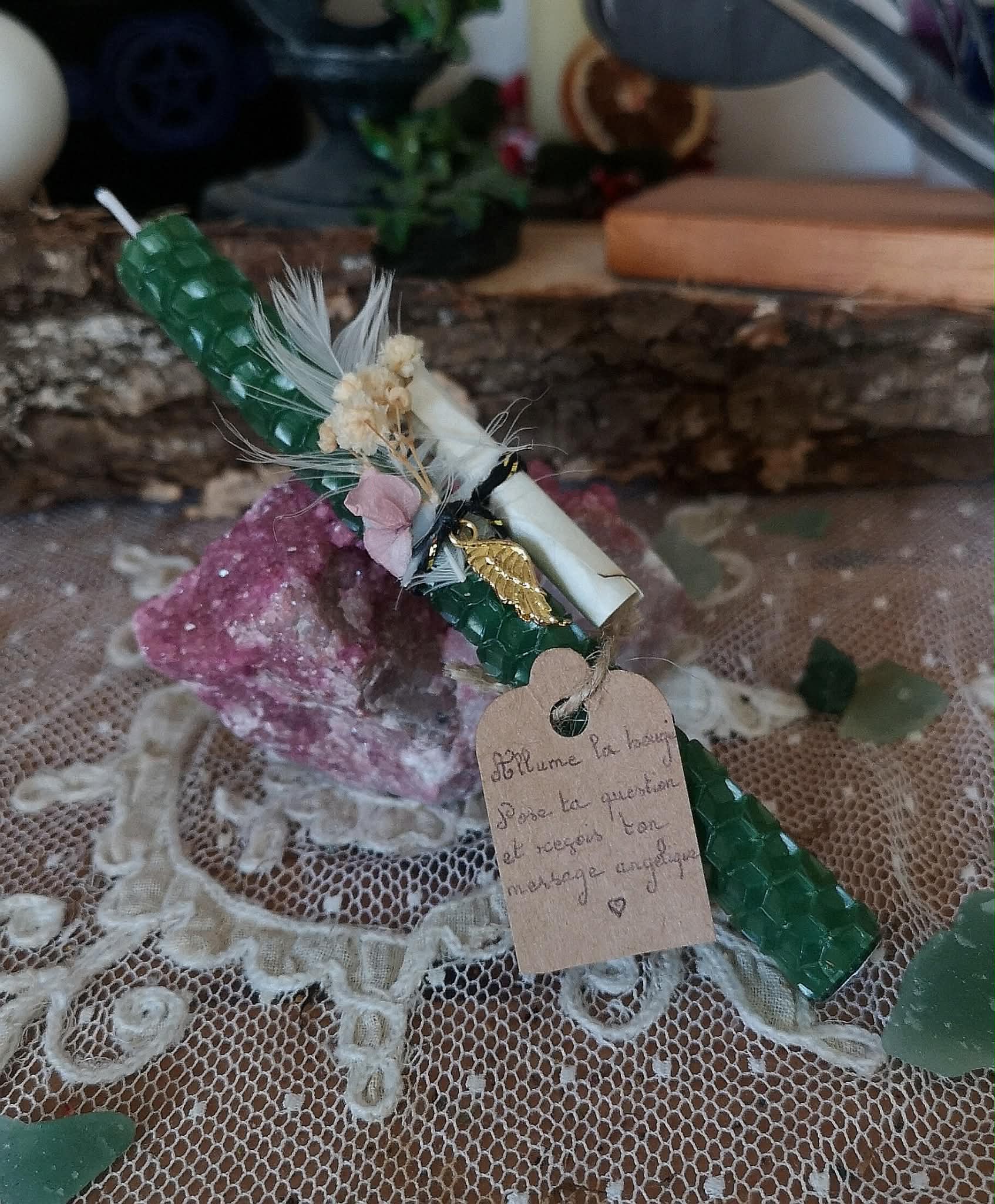 Le parchemin est le cœur sacré de cette création. Il ne t’appartient pas encore tout à fait — car c’est un message des anges qui y a été inscrit pour toi. Des mots choisis dans les royaumes subtils, porteurs d’une guidance, d’un souffle d’encouragement ou d’une lumière pour ta route printanière. Découvre-le lors de ton rituel, lis-le avec ton cœur, et laisse-le résonner en toi. Il sera retiré avant l’allumage de la bougie, et pourra être conservé précieusement dans ton espace sacré, relu à chaque nouvelle lune, ou glissé sous ton oreiller les nuits où tu as besoin de te sentir accompagnée.