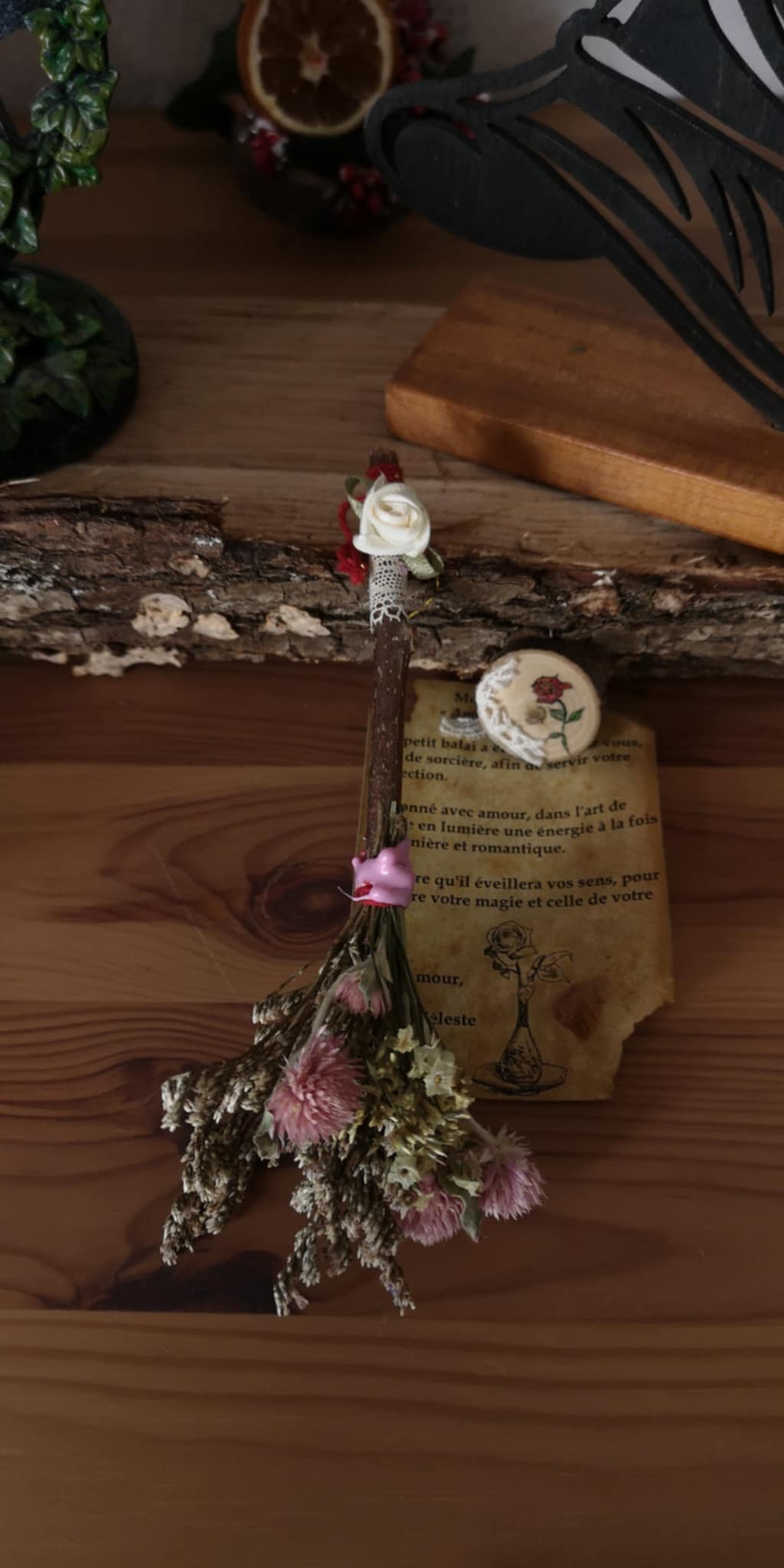 - Un mini balai de sorcière authentique orné de délicates plantes séchées, symbole de protection et d’amour