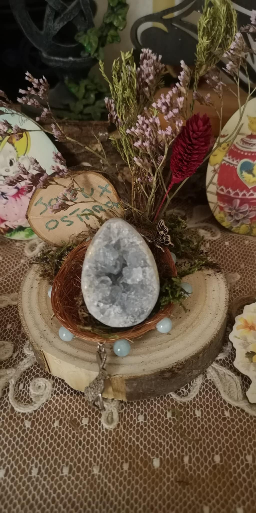Ce joli nid décoratif ornera avec grâce votre autel pour célébrer l’équinoxe de printemps, ou embellira votre table familiale lors de votre week-end pascal. Il sera le témoin silencieux de votre connexion à la roue de l’année et aux cycles éternels de la nature.
