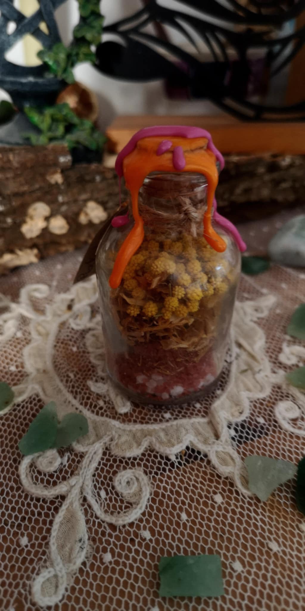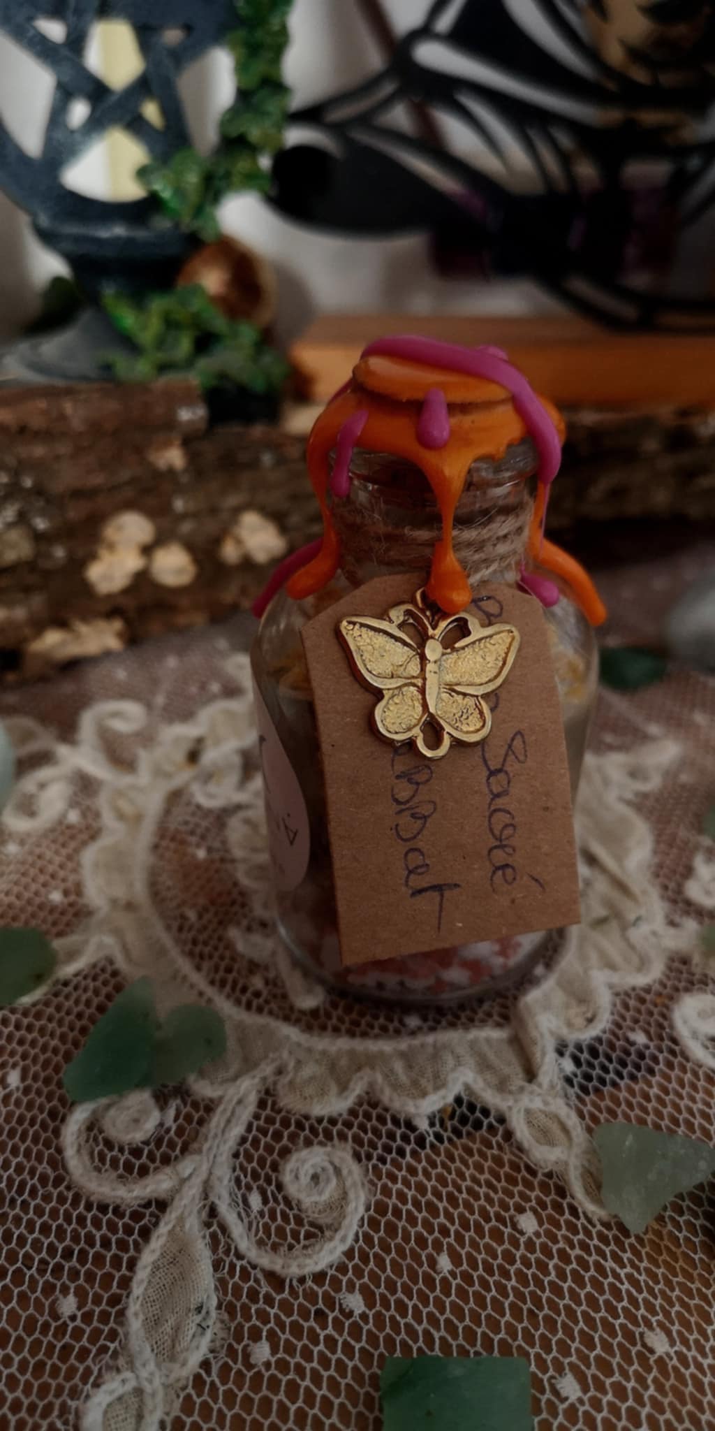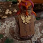 Composée avec intention, elle renferme des perles de sel purificatrices, du sel rouge aux vertus protectrices et énergisantes, des fleurs de souci — gardiens des passages entre les mondes, associés à la divination et aux rites saisonniers — et du mimosa, symbole de lumière solaire, de joie et d’éveil spirituel. Une breloque papillon doré couronne l’ensemble, totem de métamorphose et de renaissance.
